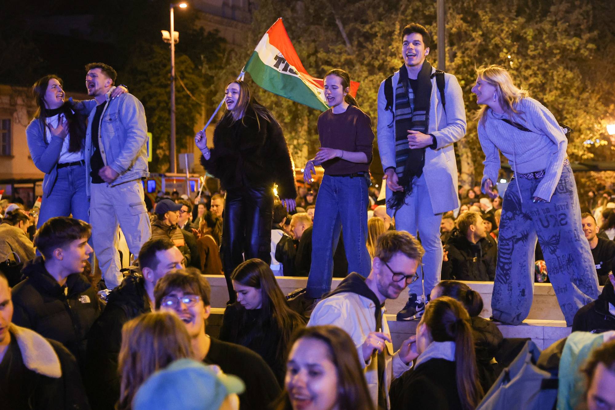 أنصار المعارضة يحتفلون بعد الفوز الانتخابي في بودابست فجر الاثنين (أ.ف.ب)