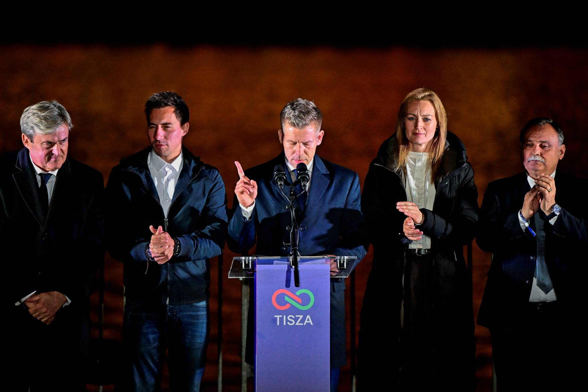 مرشح المعارضة بيتر ماغيار يلقي كلمة أمام أنصاره في بودابست ليل الأحد (رويترز)