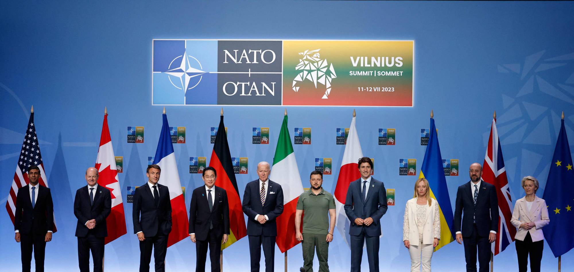 صورة جماعية لقادة مجموعة السبع مع الرئيس الأوكراني في فيلنيوس (أ.ف.ب)