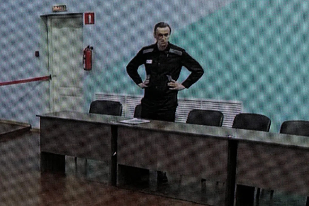 السياسي المعارض الروسي أليكسي نافالني يظهر على شاشة عبر رابط فيديو قبل جلسة استماع لمحكمة مدينة موسكو في الدعوى الجنائية المقامة عليه بتهم عديدة في 4 أغسطس 2023 (رويترز)