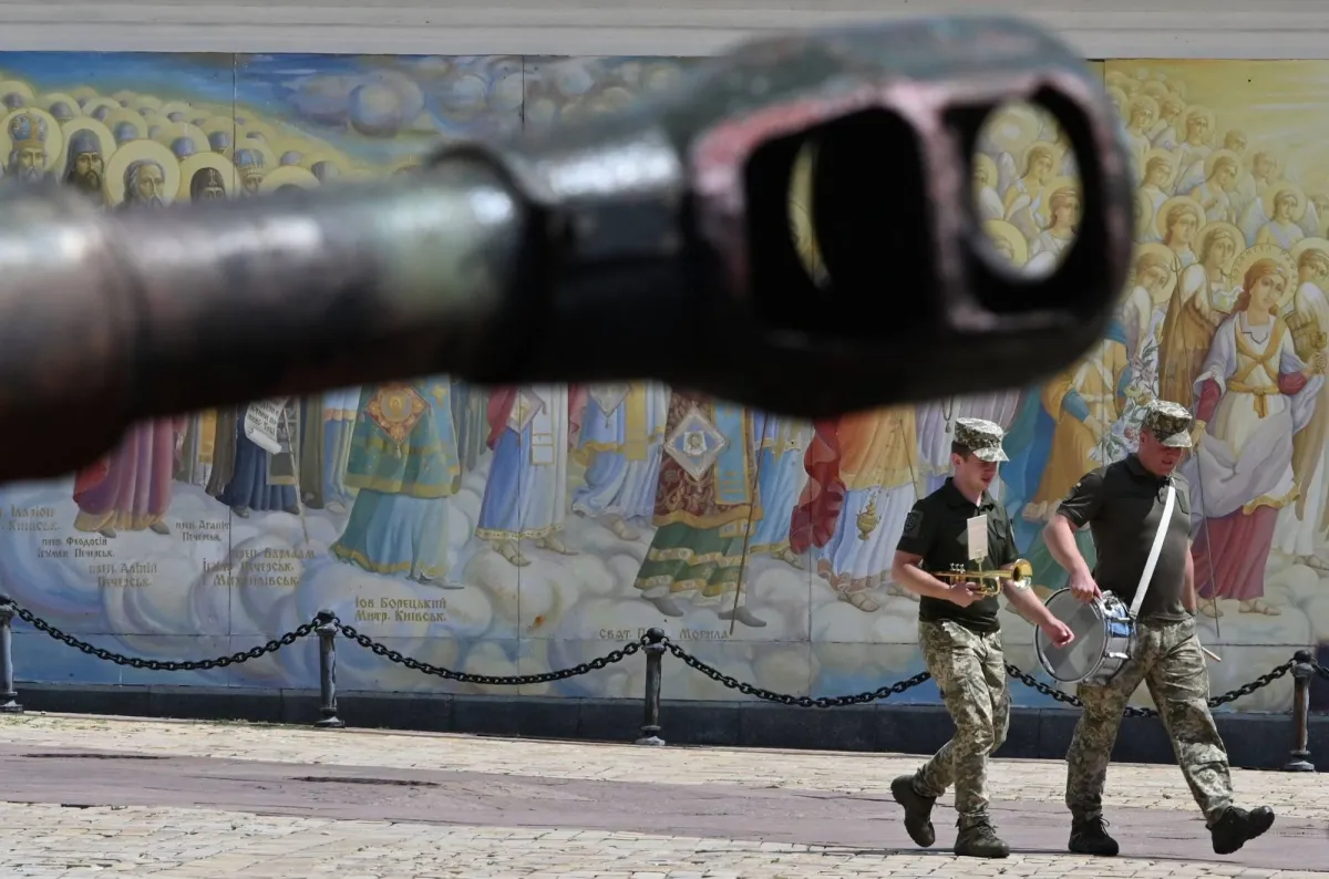 عسكريون أوكرانيون يمشون بجوار دبابة خلال معرض في الهواء الطلق للمركبات العسكرية الروسية المدمرة في ساحة ميخايلو في كييف (أ.ف.ب)