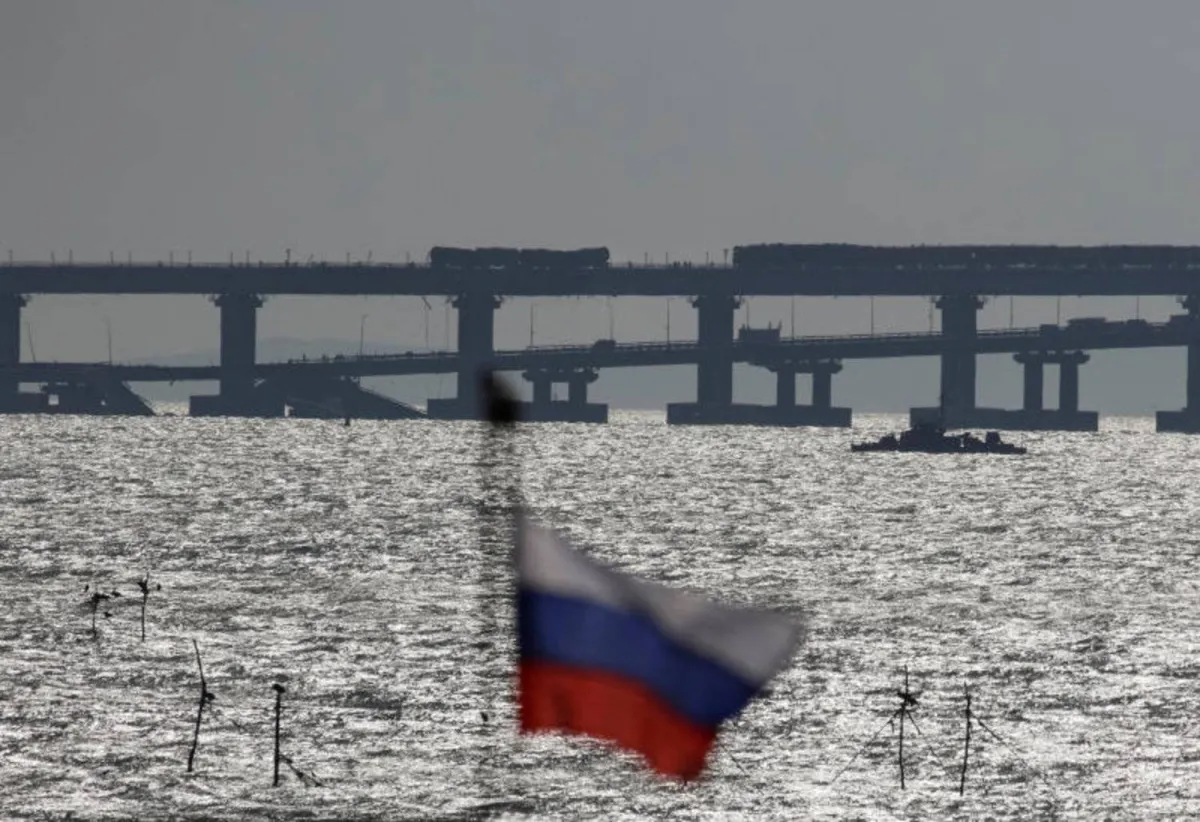جسر كيرش الذي تعرض للتفجير... ويبدو العلم الروسي (رويترز)
