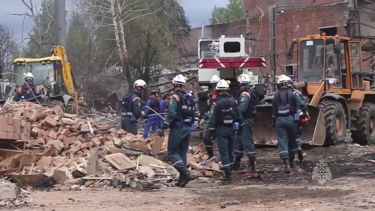 عمال الطوارئ الروس خلال تفقد موقع انفجار مصنع للبصريات في منطقة موسكو (أ.ب)