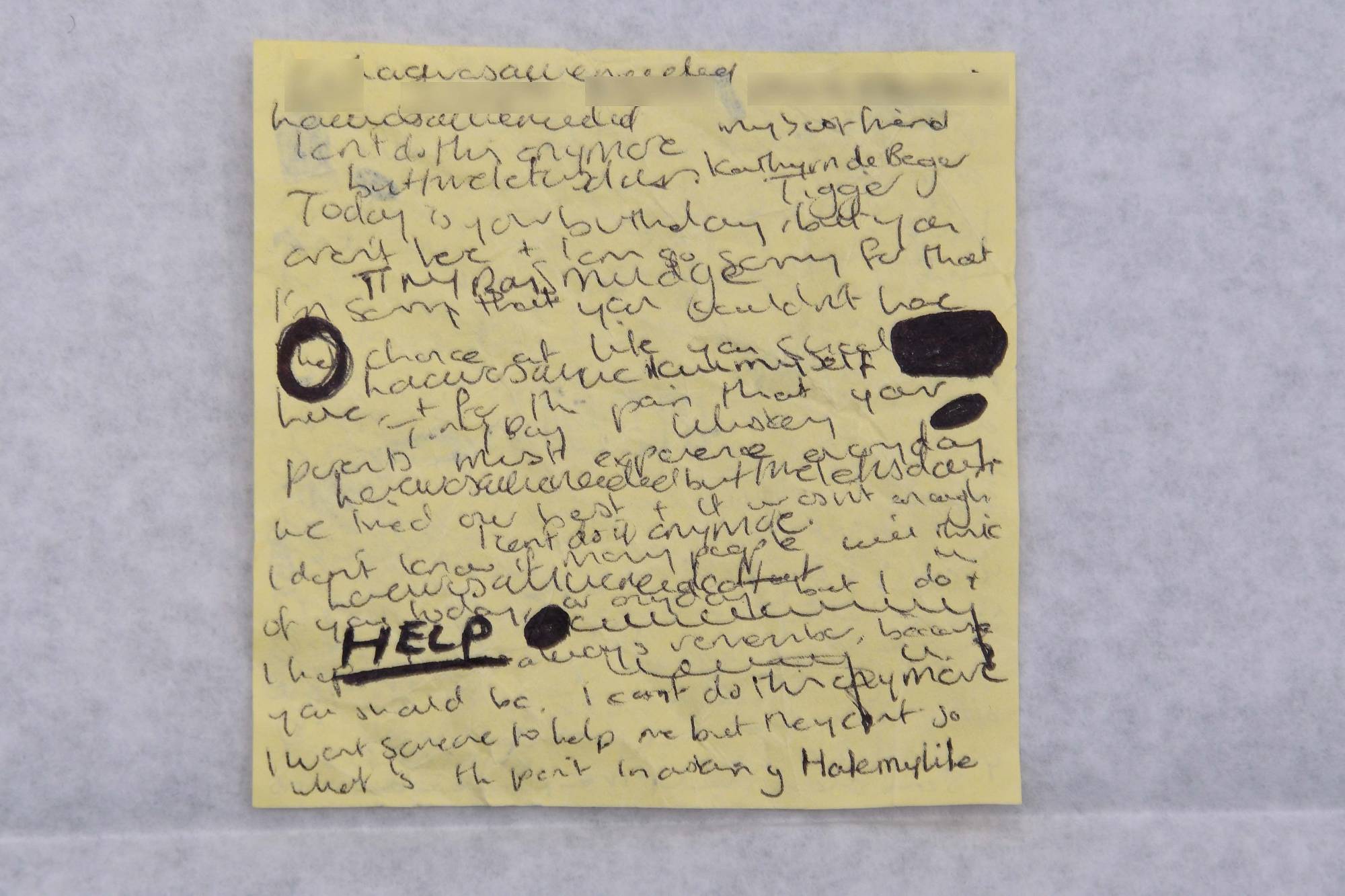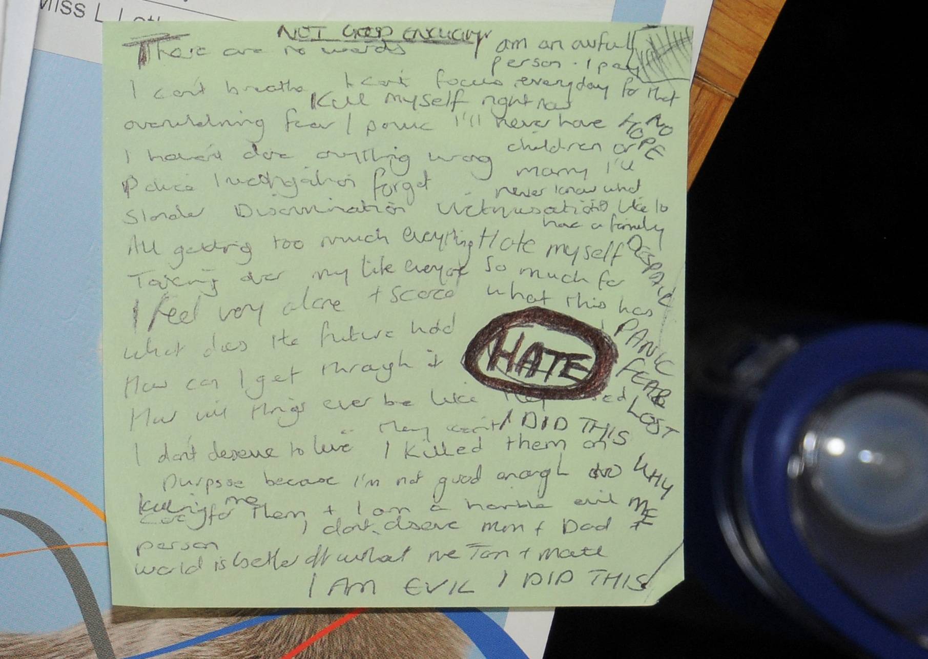 وقالت في الملاحظات المكتوبة بخط اليد، التي عثر عليها شرطيون كانوا يفتشون منزلها بعد القبض عليها، «قتلتهم عمدا لأنني لا أتمتع بالقدر الكافي من الطيبة لرعايتهم... أنا شريرة بشعة... أنا شريرة وفعلت هذا».