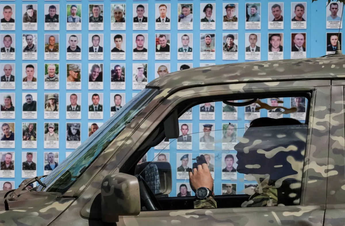 جندي أوكراني داخل سيارة عسكرية بجانب النصب التذكاري للجنود الذين سقطوا منذ اندلاع الحرب (رويترز)