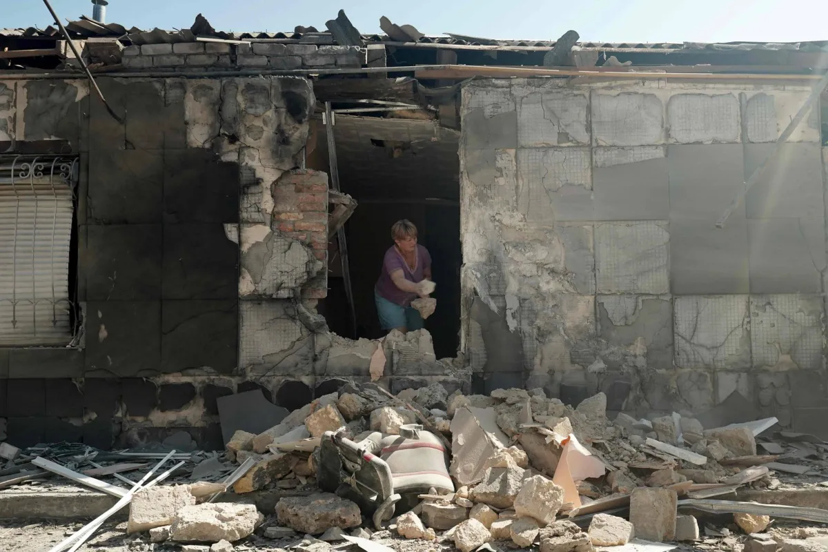 مواطنة أوكرانية تقوم بإزالة الأنقاض في منزلها المدمر نتيجة هجوم صاروخي روسي على خيرسون بأوكرانيا في 14 أغسطس 2023 (أ.ف.ب)