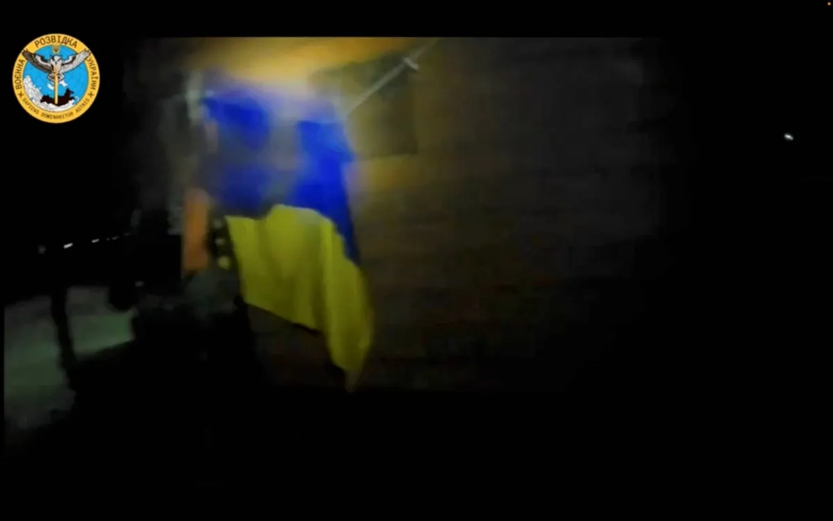 جندي أوكراني يعلق علم بلاده خلال عملية قامت بها القوات الأوكرانية في موقع تم تحديده بالقرب من مستوطنتي أولينيفكا وماياك، في شبه جزيرة القرم (رويترز)
