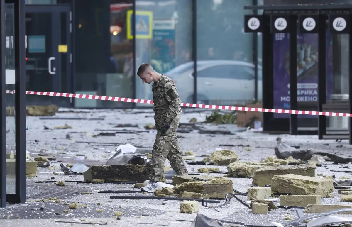 جندي روسي يعاين أضراراً ناجمة عن هجوم بمسيَّرة أوكرانية على مبنى في موسكو (أرشيفية - إ.ب.أ)