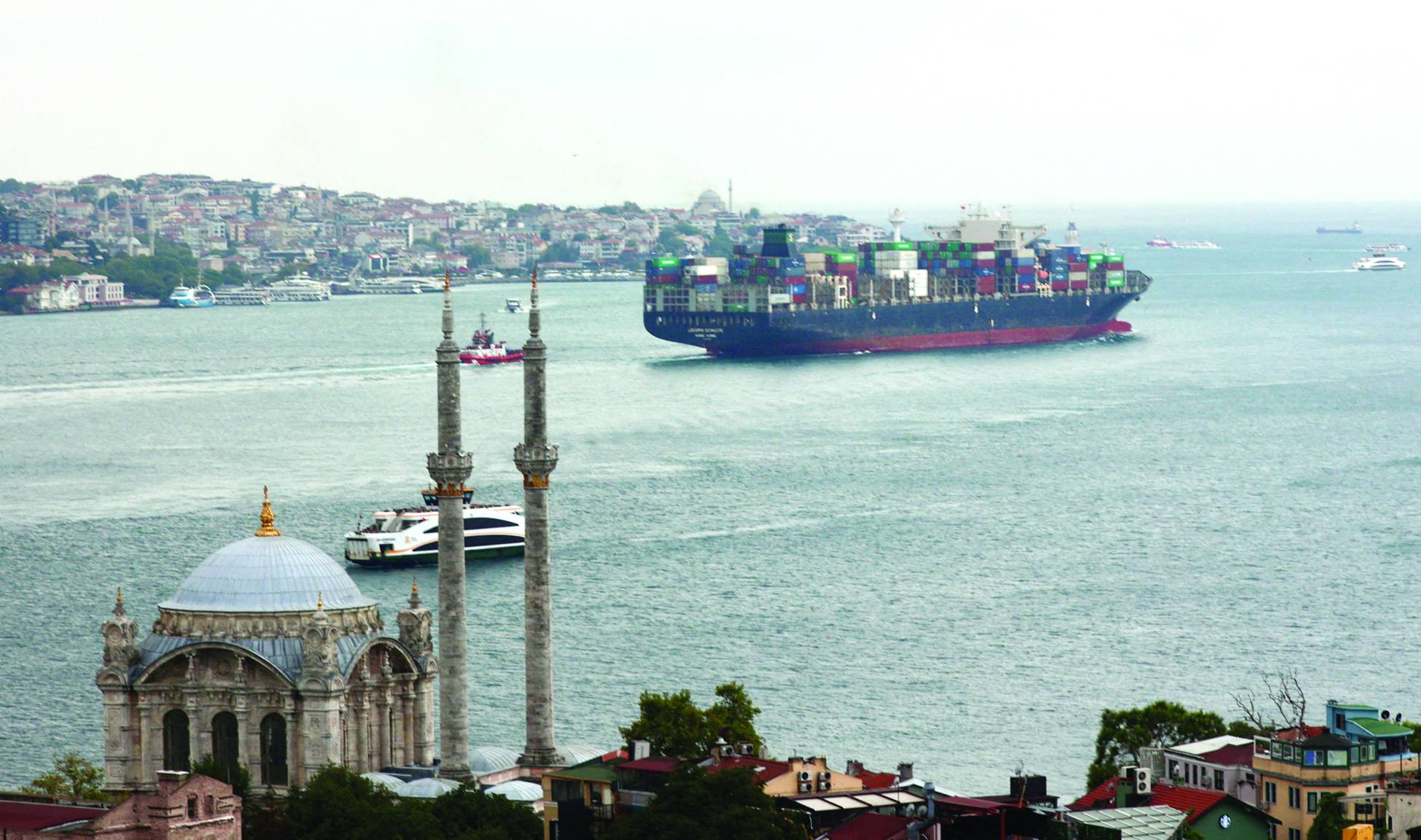 سفينة الحاويات العملاقة «جوزيف شولت» تعبر مضيق البوسفور في طريقها إلى ميناء بيرايوس اليوناني بوصفها أول سفينة تمر عبر الممر الأوكراني (إ.ب.أ)