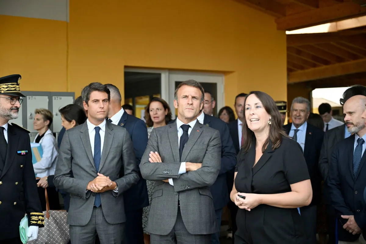 الرئيس الفرنسي إيمانويل ماكرون (في الوسط) ووزير التربية الفرنسي غابريال أتال (يسار) يزوران مدرسة دانيال أرغوت المتوسطة في أورثيز بفرنسا في 5 سبتمبر 2023 (رويترز)
