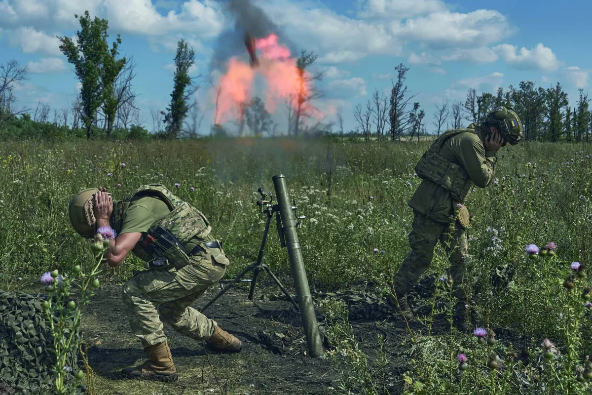 جنديان أوكرانيان يطلقان قذيفة في منطقة دونيتسك الأوكرانية (أ.ب)
