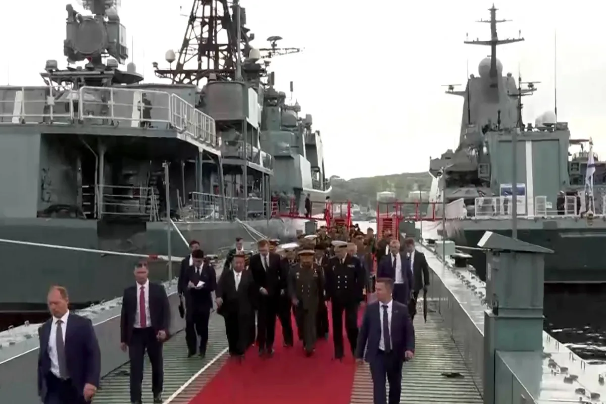 وأعلن بوتين خلال الزيارة المستمرة أن حليفه زعيم كوريا الشمالية سيحضر في فلاديفوستوك «عرضاً» لأسطول المحيط الهادئ الروسي. وفي هذه المدينة الكبيرة الواقعة في أقصى روسيا قرب الحدود مع الصين وكوريا الشمالية، صعد كيم إلى السفينة الحربية الروسية «مارشال شابوشنيكوف»، حيث كان في استقباله قائد الفرقاطة. وكان أيضاً على متن السفينة القائد العام للأسطول الروسي نيكولاي يفمينوف الذي شرح للزعيم الكوري الشمالي خصائص السفينة والأسلحة المضادة للغواصات وهي «قاذفات طوربيد رباعية وقاذفات صواريخ RBU - 6000»، بحسب وكالة «تاس».