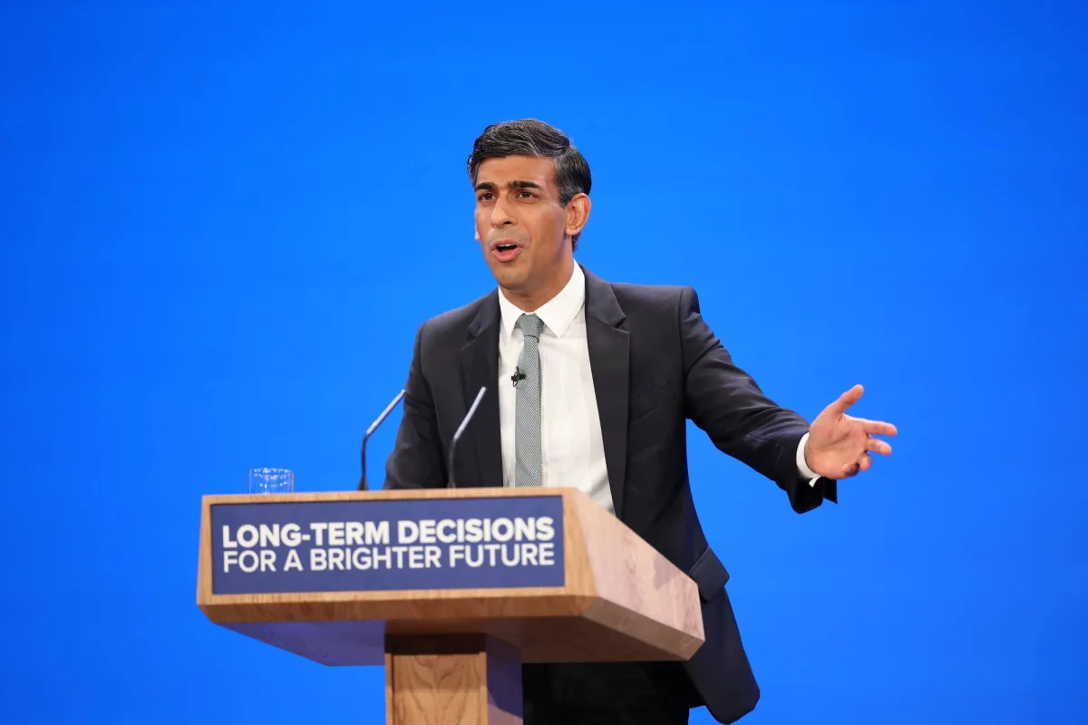 رئيس الوزراء البريطاني ريشي سوناك يلقي كلمه في مانشستر (إ.ب.أ)