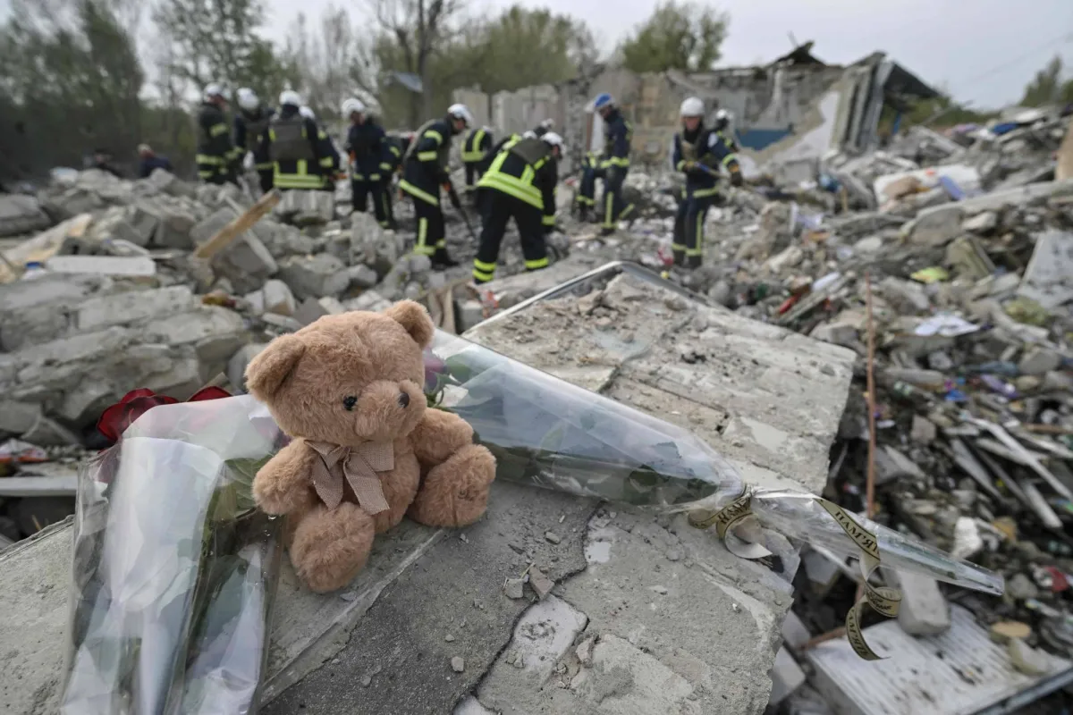 يقوم عمال الطوارئ الأوكرانيون بإزالة الحطام من موقع الغارة الروسية التي أصابت متجراً ومقهى في قرية جروزا على بعد نحو 30 كيلومتراً غرب كوبيانسك (أ.ف.ب)