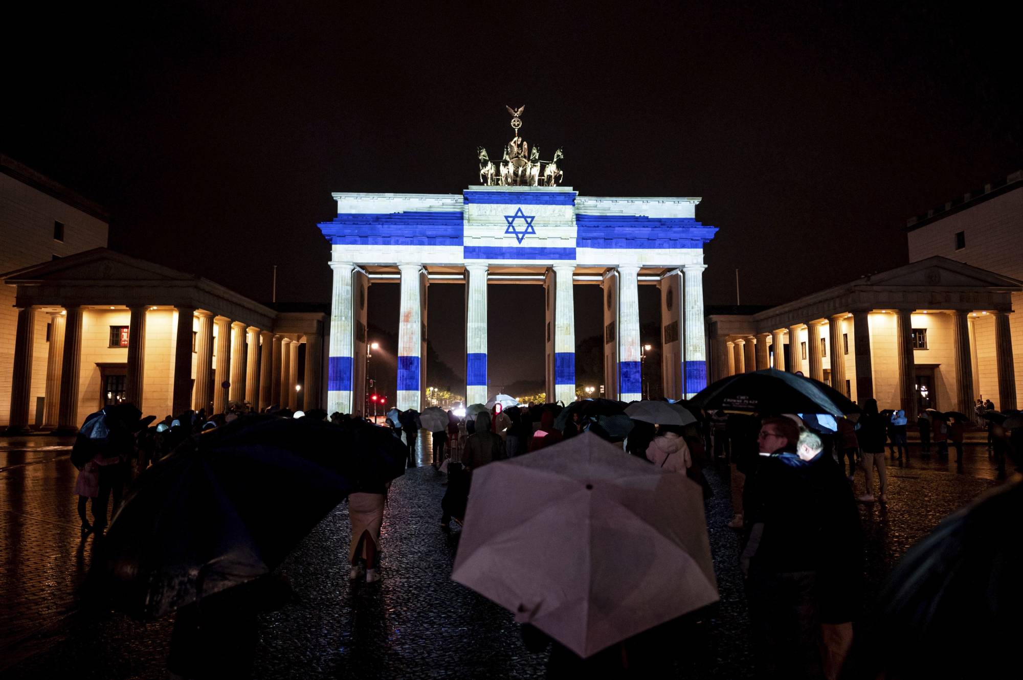 وفي وقت لاحق (السبت)، أضيئت بوابة براندنبورغ الشهيرة في برلين، وهي رمز لألمانيا الموحدة، بألوان العلم الإسرائيلي. وكتب المستشار أولاف شولتس على موقع «إكس»: «تضامناً مع إسرائيل»، ورد السفير الإسرائيلي على المنصة نفسها، وشكره على «هذا الرمز الجميل».