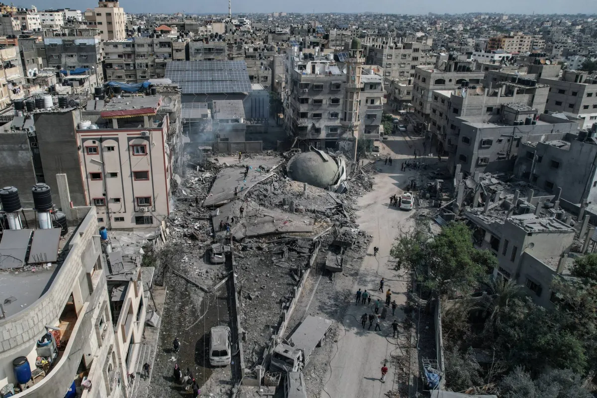 مشهد من أعلى لمسجد أحمد ياسين بعد تدميره إثر ضربة صاروخية إسرائيلية على قطاع غزة (د.ب.أ)