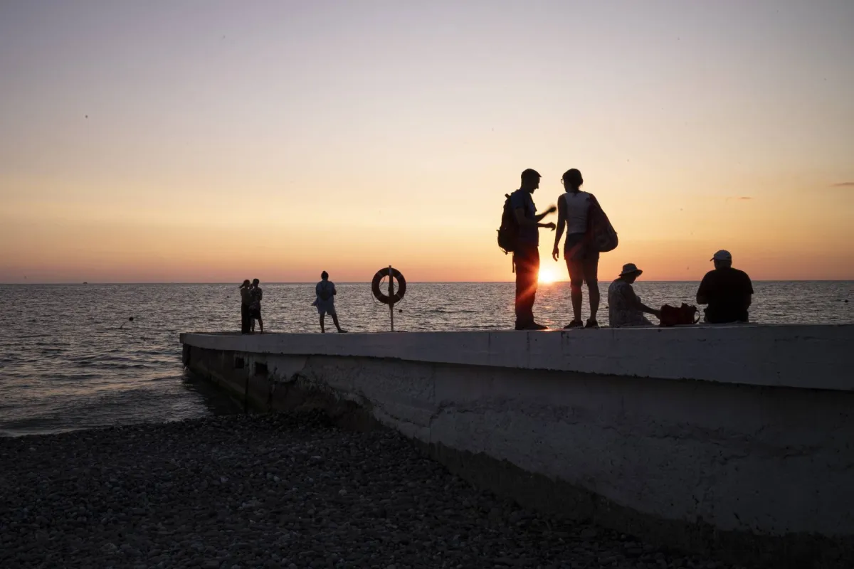 أشخاص يشاهدون غروب الشمس على رصيف بحري في سوتشي (أ.ب)