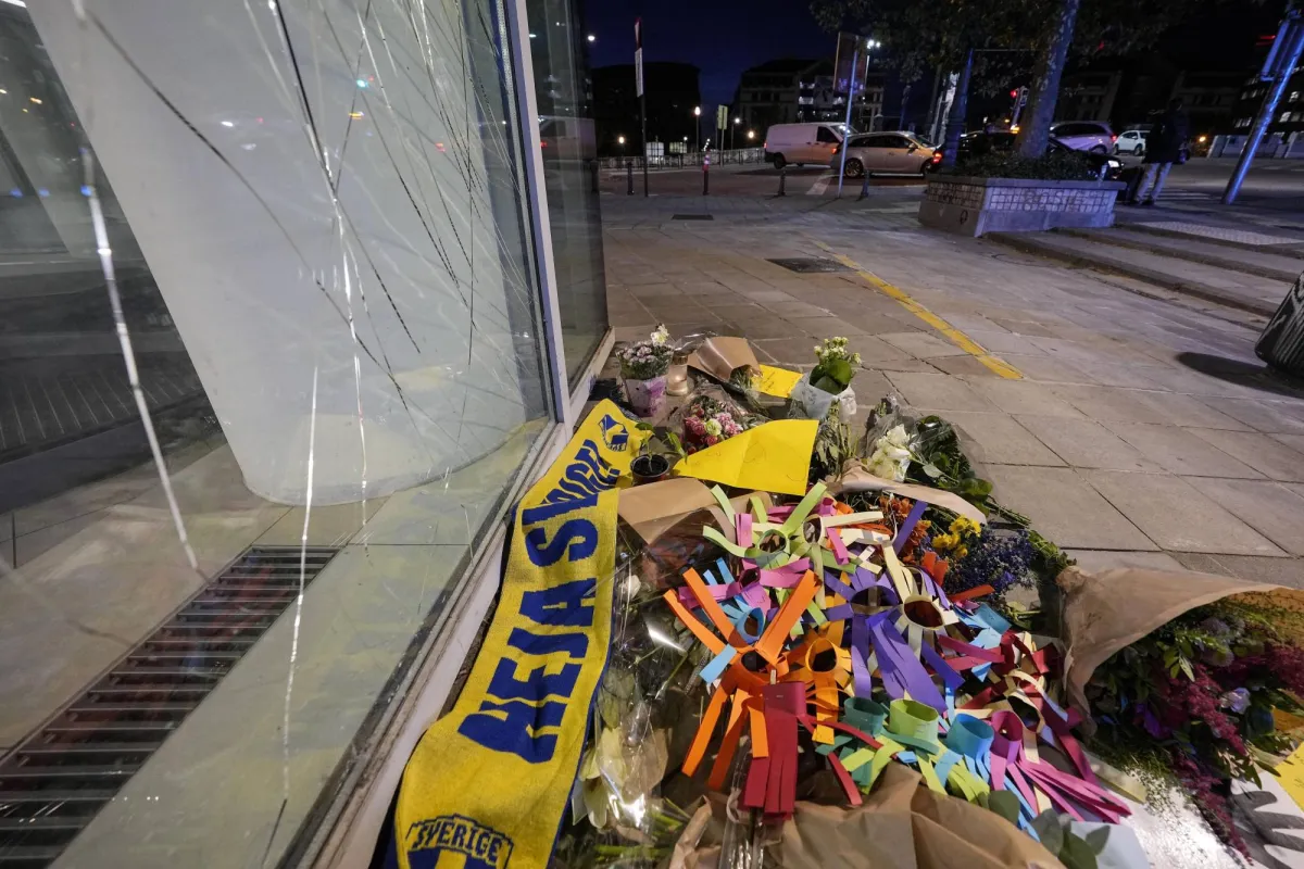 زهور ووشاح سويدي في مكان قريب من مسرح إطلاق النار في بروكسل (أ.ب)