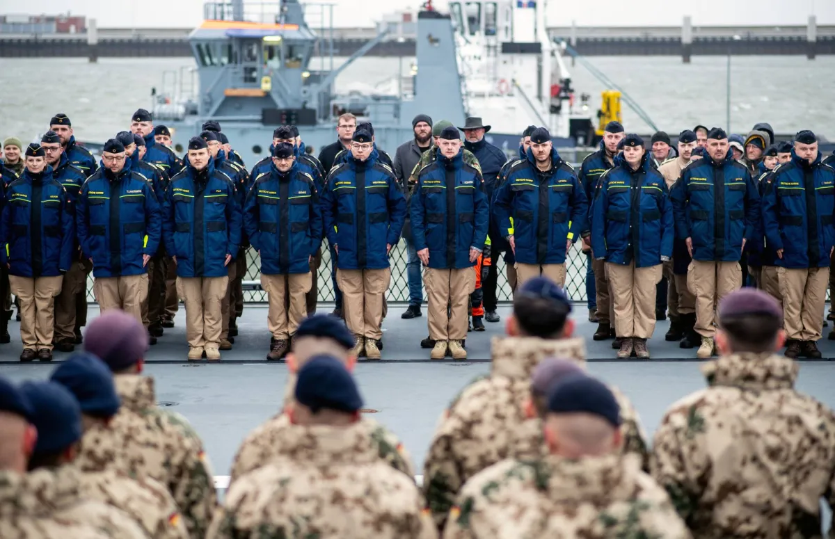 أفراد طاقم من البحرية الألمانية على متن السفينة في القاعدة البحرية قبل مغادرتها في مهمة الأمم المتحدة في البحر الأبيض المتوسط قبالة سواحل لبنان (د.ب.أ)