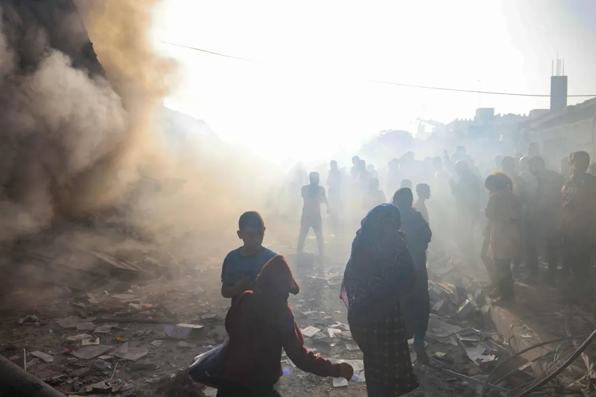 فلسطينيون يسيرون وسط الدمار الناتج عن القصف الإسرائيلي (أ.ف.ب)