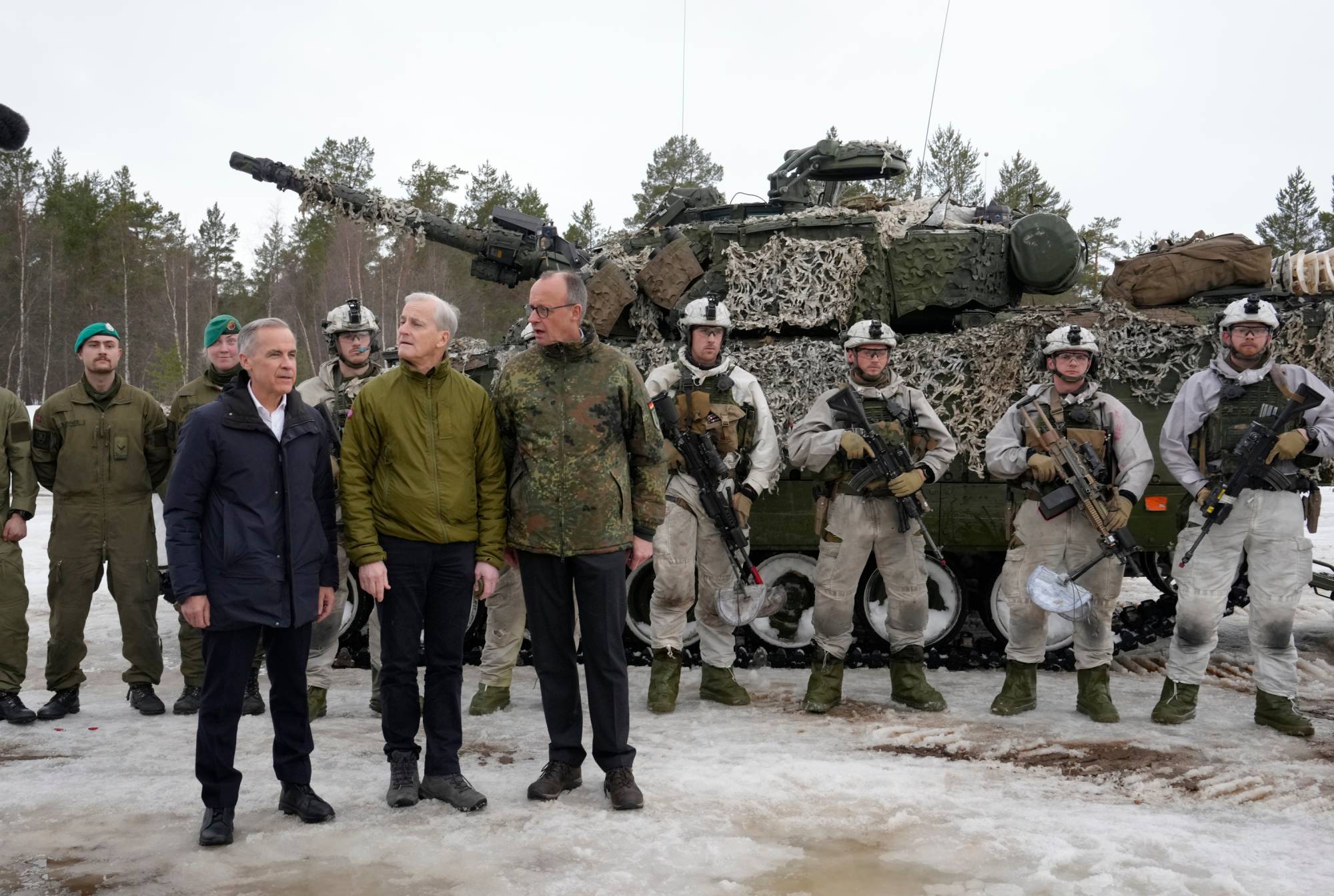 من اليمين المستشار الألماني فريدريش ميرتس ورئيس الوزراء النرويجي يوناس غار ستوره ورئيس الوزراء الكندي مارك كارني يتفقدون مسرح مناورات لقوات حلف شمال الأطلسي في باردوفوس بالنرويج (أ.ب)