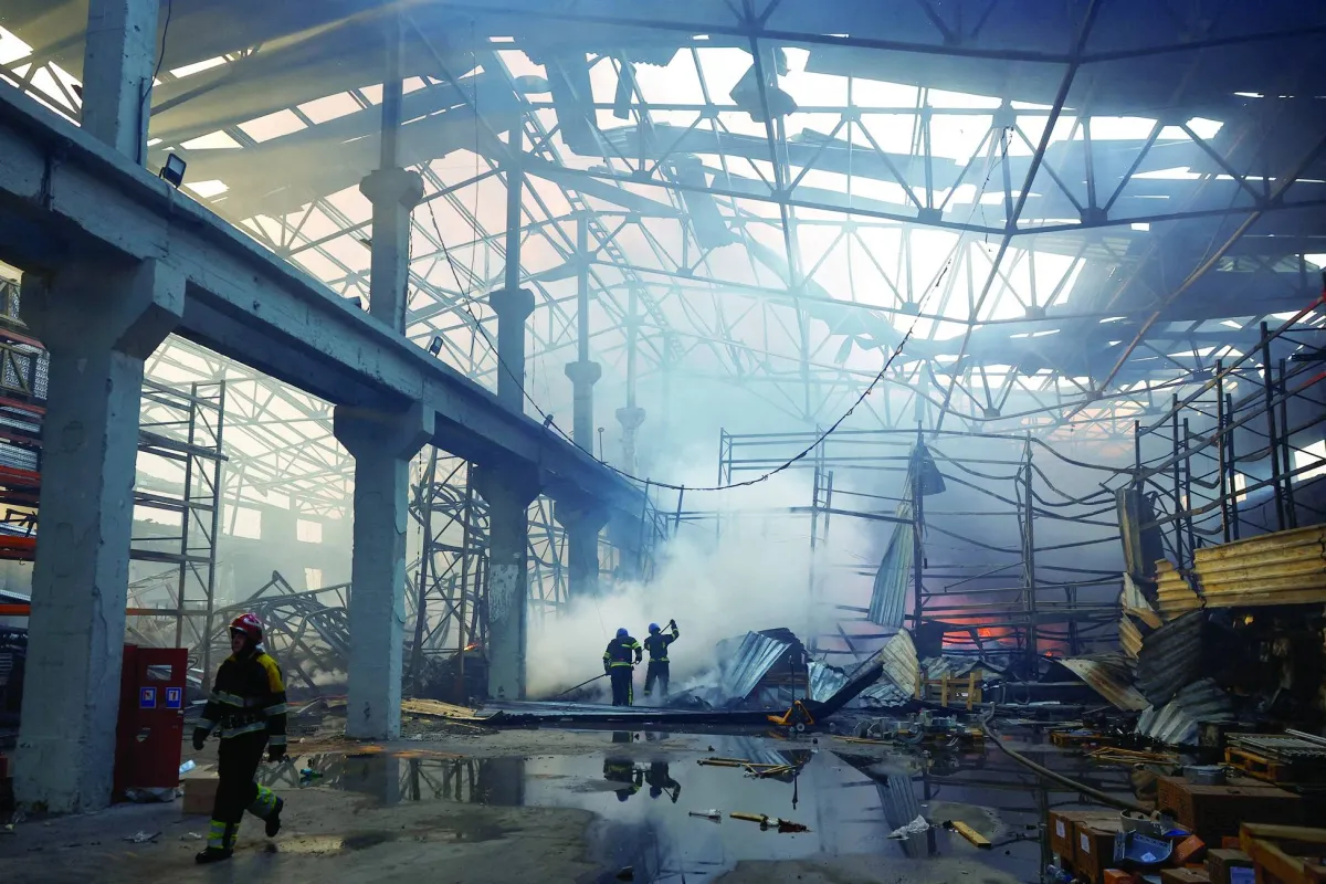 رجال إطفاء يعملون في موقع مستودع تعرض لأضرار بالغة بضربة صاروخية وسط الهجوم الروسي على كييف (رويترز)