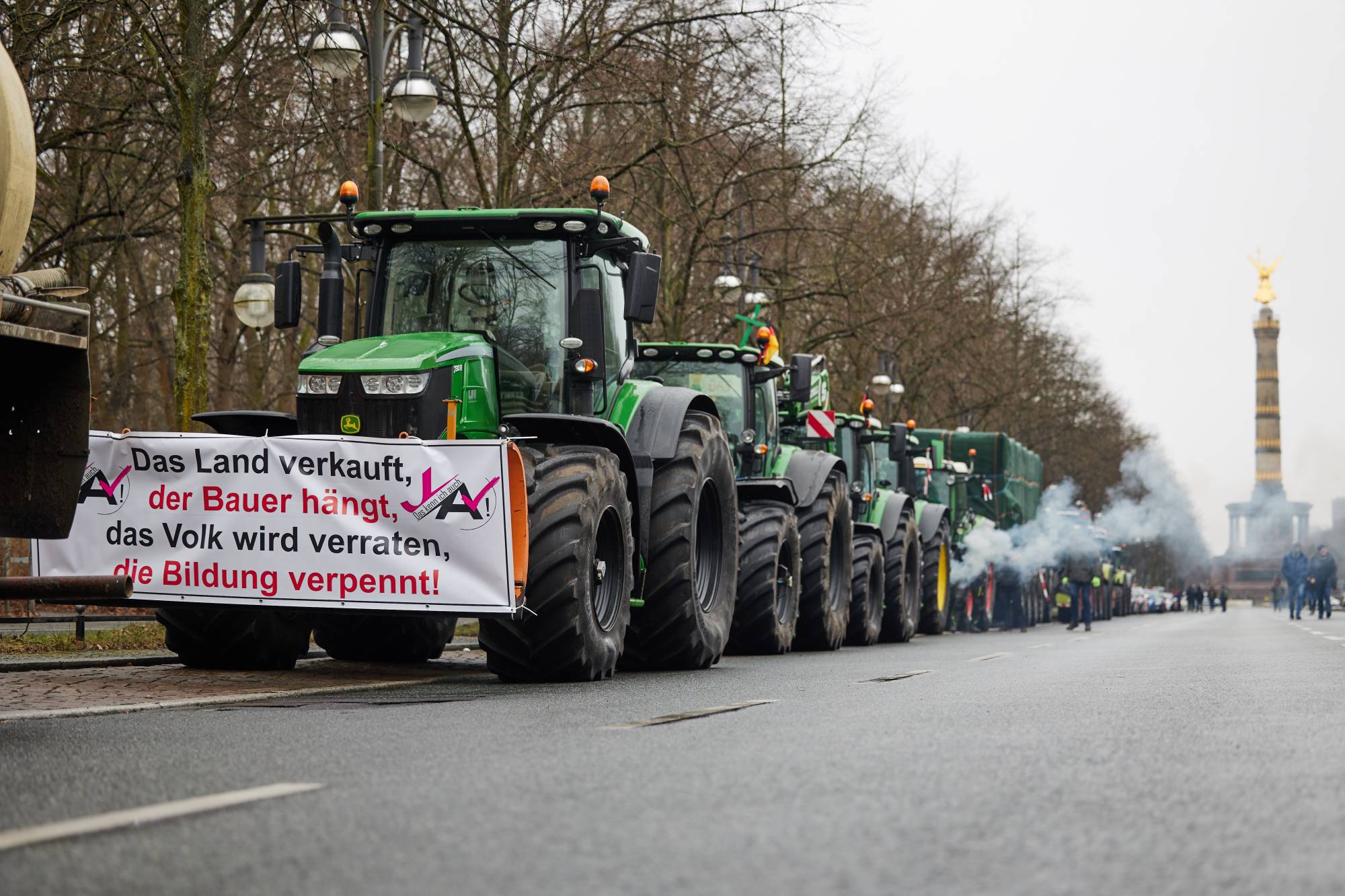 ووفقاً للشرطة، تم إحصاء نحو 100 جرار، و35 مقطورة، و20 شاحنة، وما بين 100 و150 شخصاً بعد ظهر اليوم بالقرب من بوابة براندنبورغ. وقد تم إغلاق شارع «17 يونيو» بين النجمة الكبيرة وبوابة براندنبورغ.