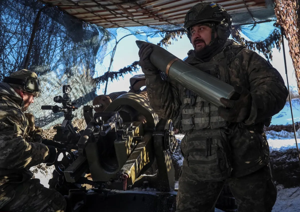 جنود أوكرانيون يطلقون قذيفة مدفعية تجاه القوات الروسية في مارينكا (رويترز)