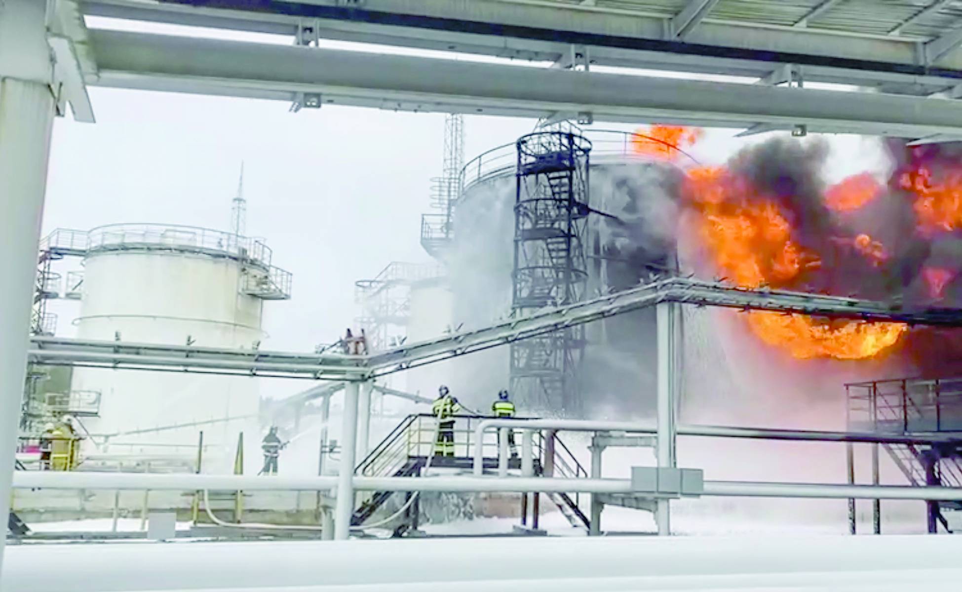 وأظهرت مقاطع فيديو كرة نارية ضخمة تنبعث من صهاريج للتخزين في مستودع النفط، بينما تصاعدت سحابة من الدخان الأسود فوق البلدة التي تضم نحو 60 ألف نسمة.