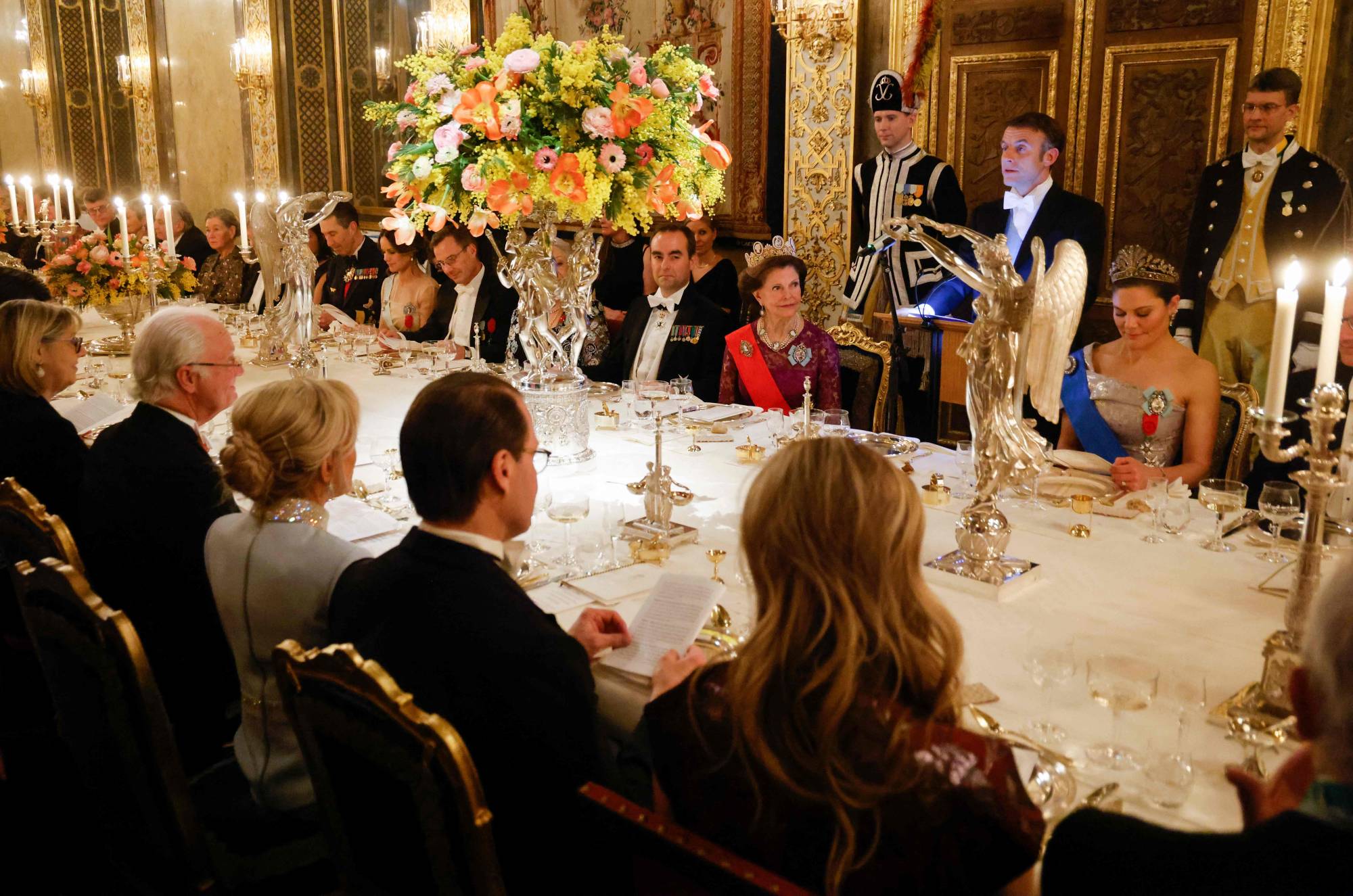 الرئيس الفرنسي إيمانويل ماكرون متحدثاً في حفل العشاء الذي أقيم على شرفه في السويد بمناسبة زيارته الرسمية (أ.ف.ب)