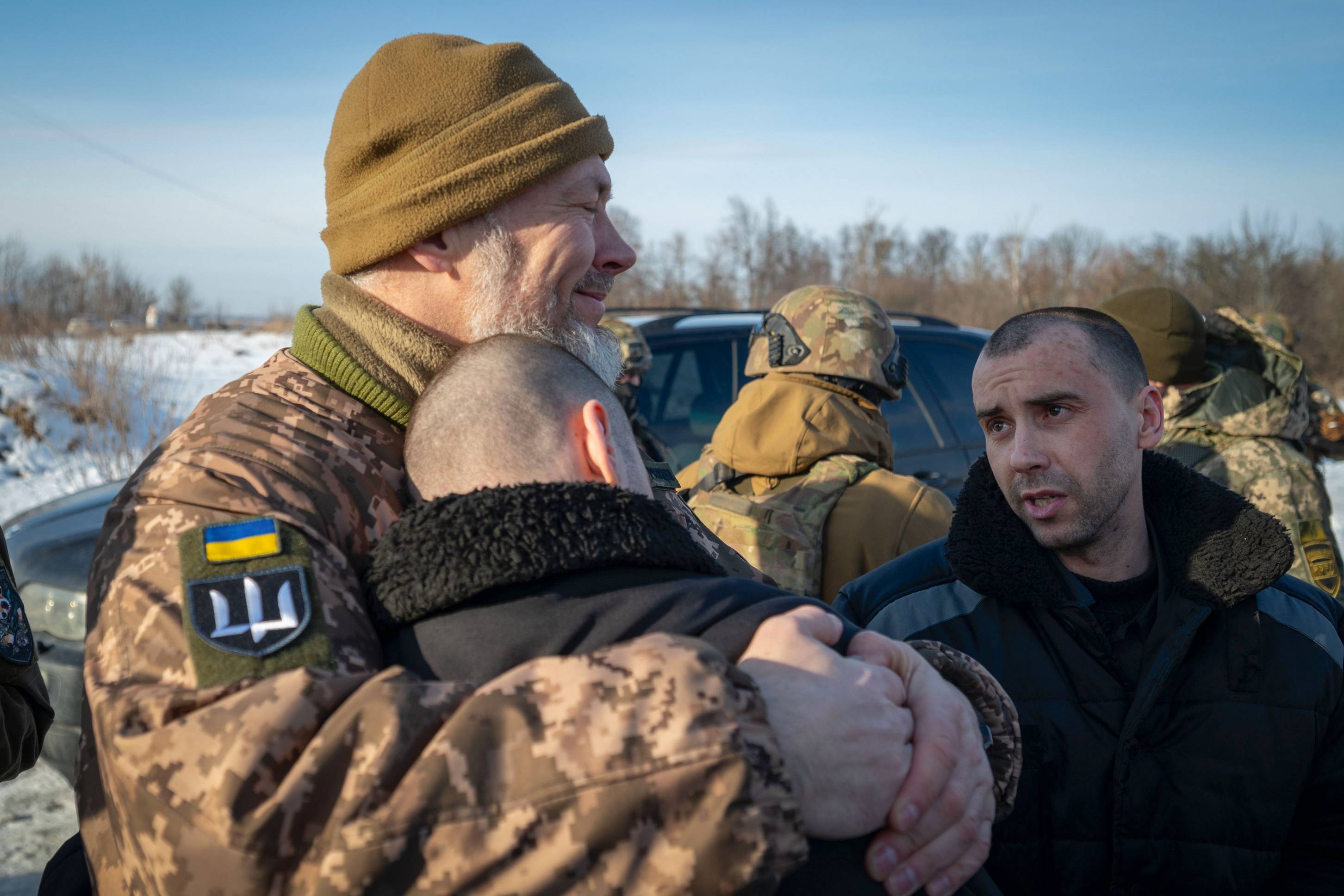صورة وزّعها الرئيس الأوكراني فولوديمير زيلينسكي الأربعاء وتظهِر عسكريين أسرى أُعيدوا إلى أوكرانيا في عملية تبادل واسعة مع روسيا (أ.ب)