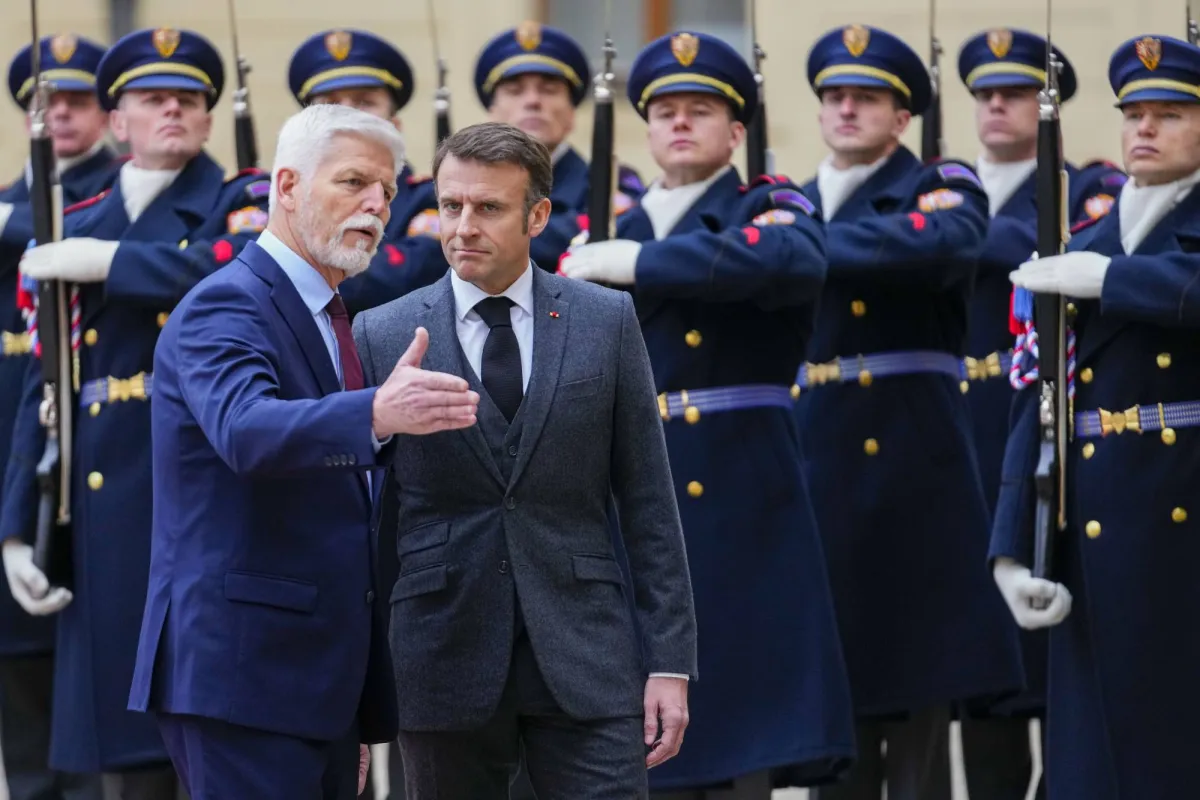 رئيس جمهورية التشيك بيتر بافيل (يسار) يستقبل نظيره الفرنسي إيمانويل ماكرون في قلعة براغ (أ.ب)