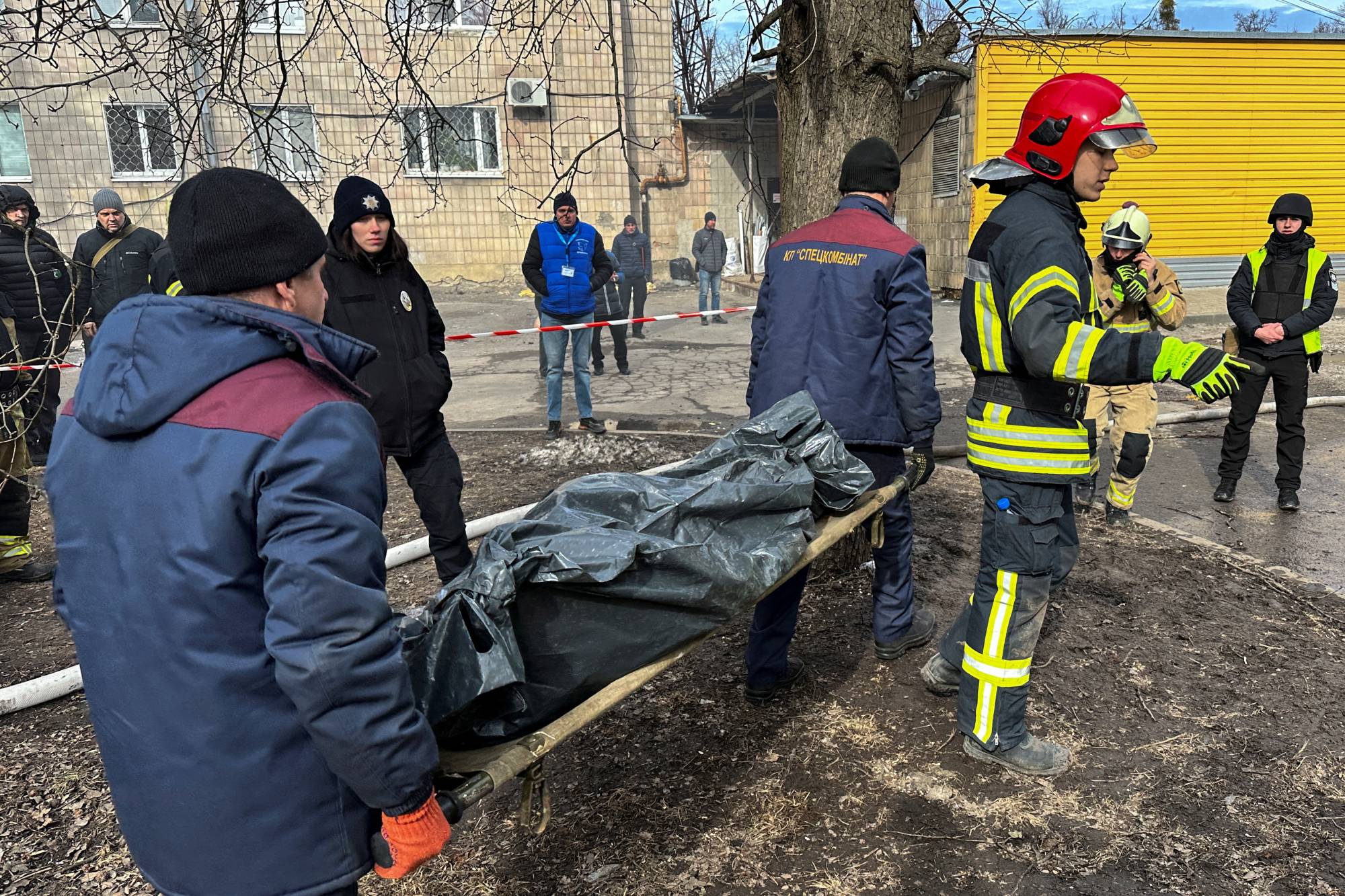 عمال البلدية يحملون جثة شخص قتل تحت أنقاض مبنى سكني تضرر بشدة من غارة روسية بطائرة من دون طيار وسط الهجوم الروسي على أوكرانيا في سومي (رويترز)