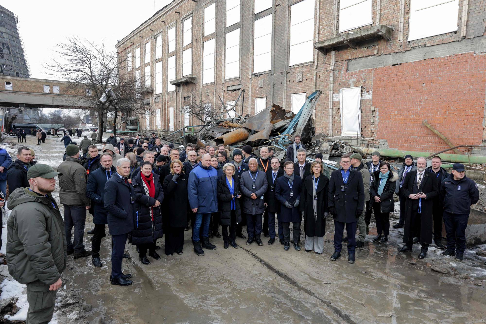 وزير الدفاع الأوكراني دينيس شميهال (في الوسط) مع قادة أوروبيين في الذكرى السنوية الرابعة للغزو الروسي الشامل لأوكرانيا (أ.ف.ب)