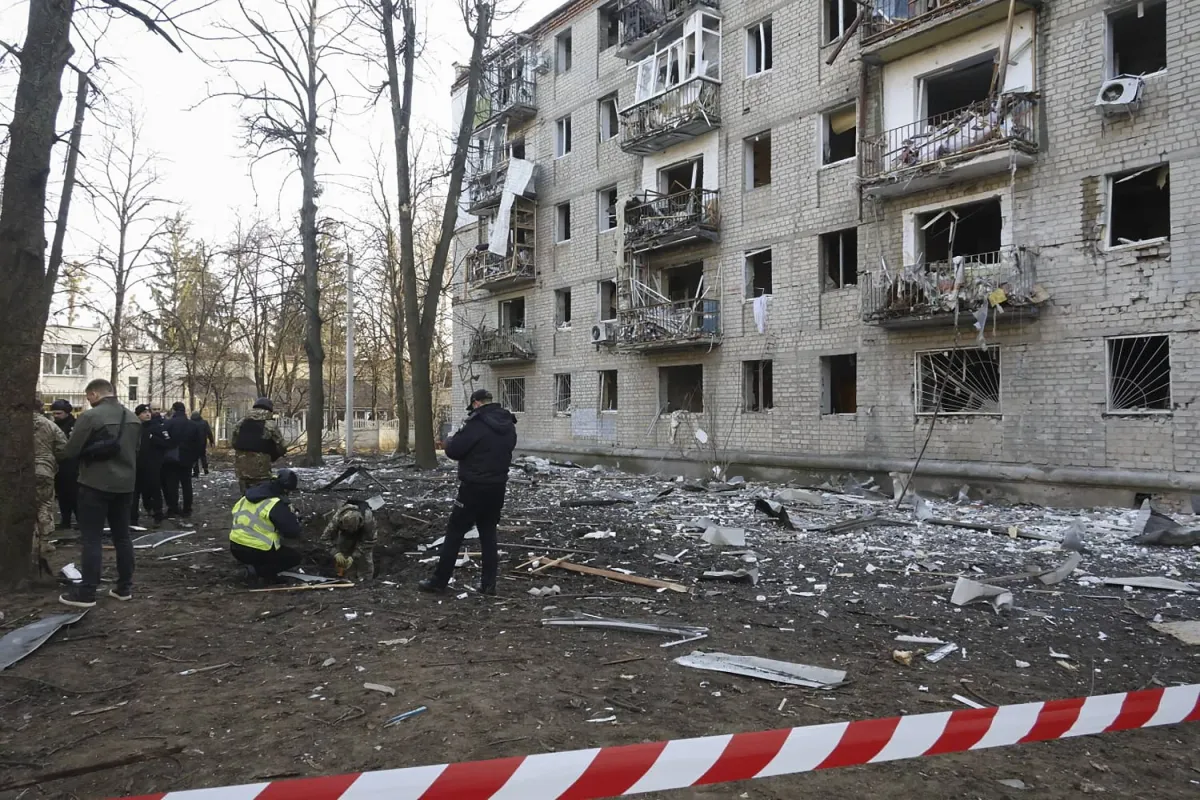 الشرطة تؤمن موقع القصف بالقرب من المباني السكنية في خاركيف بأوكرانيا (إ.ب.أ)