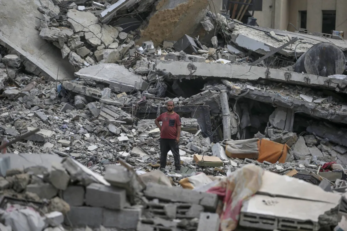 فلسطيني يقف فوق أنقاض منزله المدمر في خان يونس جنوب قطاع غزة (إ.ب.أ)