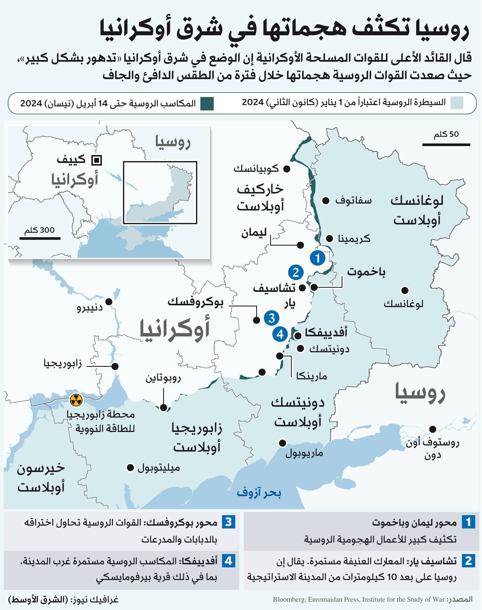 وأصرّ الرئيس الأوكراني فولوديمير زيلينسكي، وكان يقف إلى جانب الأمين العام لحلف شمال الأطلسي ينس ستولتنبرغ في كييف، على أنّه «علينا أن نحبط معاً الهجوم الروسي»، مشيراً إلى أنّ روسيا «تحاول الإفادة» من التأخير في المساعدات الغربيّة.