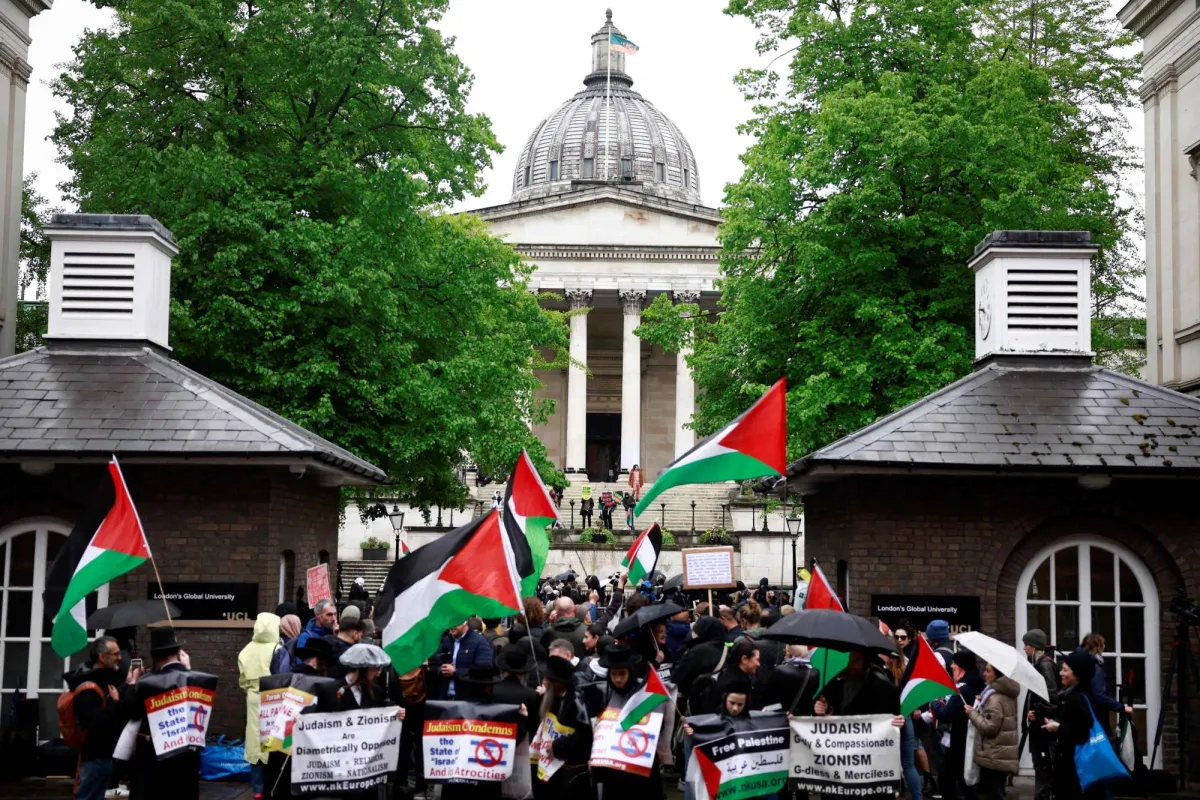 متظاهرون يطالبون بوقف حرب غزة في جامعة لندن الجمعة (أ.ف.ب)