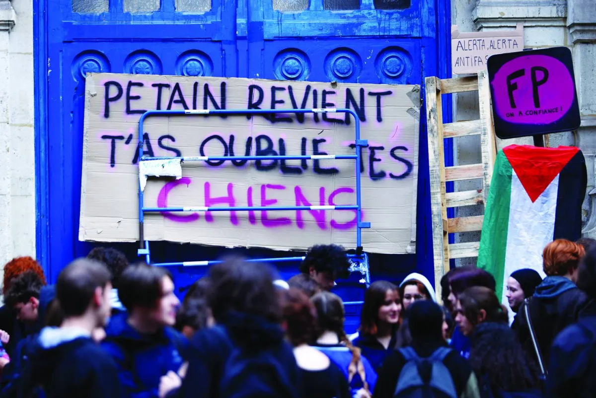 طلاب مدرسة ثانوية في باريس يسدون المنفذ الى المدرسة احتجاجاً على صعود اليمين المتطرف أمس (رويترز)