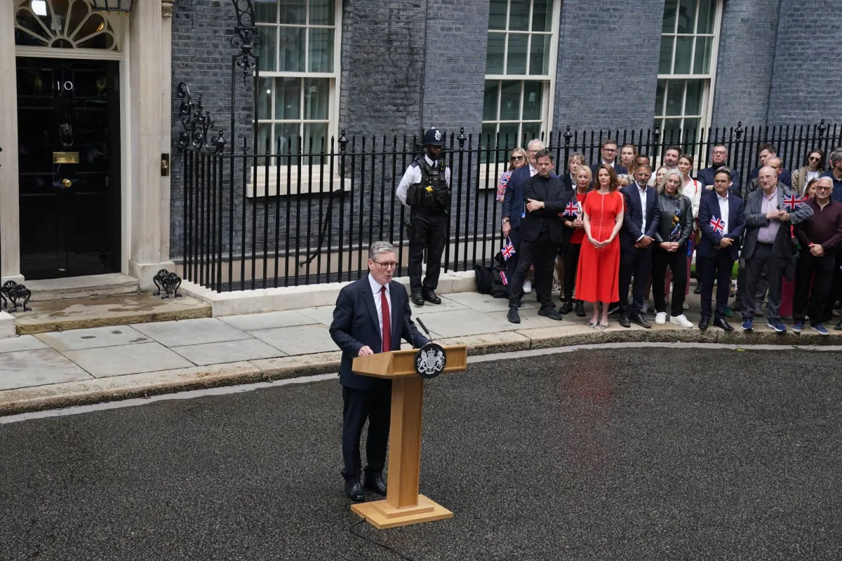كير ستارمر رئيس وزراء بريطانيا في كلمة للصحافيين أمام مقر رئاسة الوزراء في لندن (د.ب.أ)