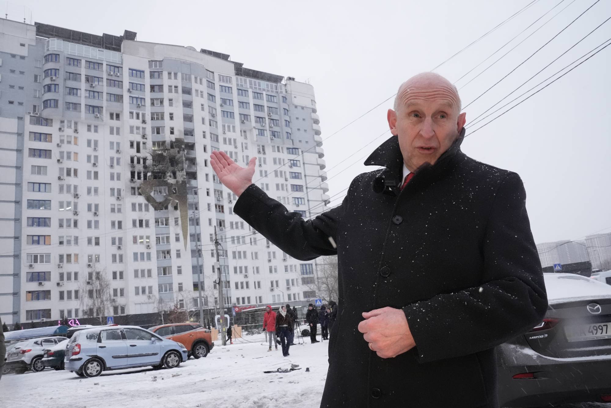 وزير الدفاع البريطاني جون هيلي في كييف يشير إلى عمارة أصيبت في الهجمات الروسية (إ.ب.أ)