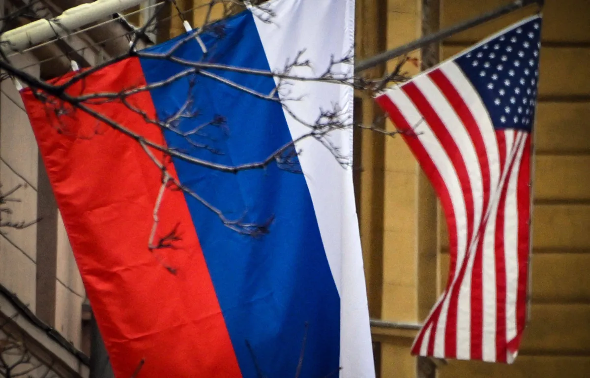 العلمان الأميركي والروسي عند مدخل السفارة الأميركية في موسكو (أرشيفية - أ.ف.ب)