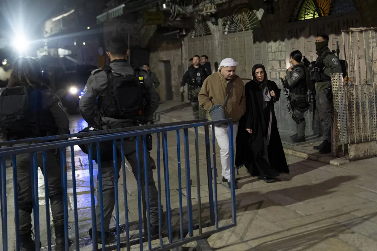 فلسطينيون يمرون عبر نقطة تفتيش بينما تنتشر الشرطة الإسرائيلية في البلدة القديمة بالقدس (أ.ب)