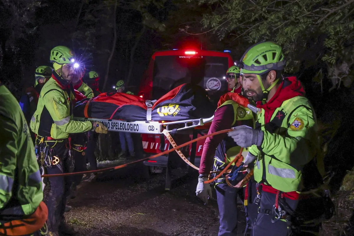 انتشل رجال الإنقاذ جثة إحدى ضحايا عربة التلفريك التي كانت تقل سياحاً جنوب نابولي وتحطَّمت بعد انقطاع الكابل (أ.ب)