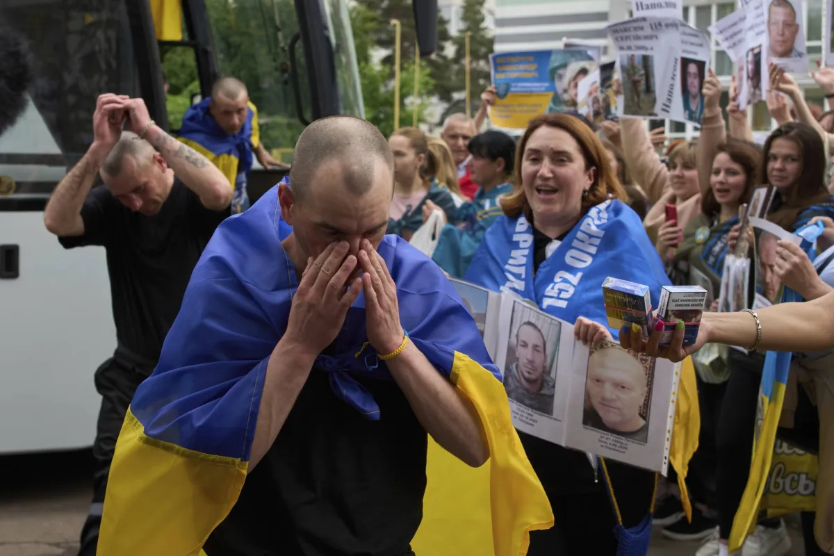 أوكرانيون يستقبلون في تشيرنهيف أسراهم عقب استكمال عملية تبادل مع روسيا أمس(أ.ب)