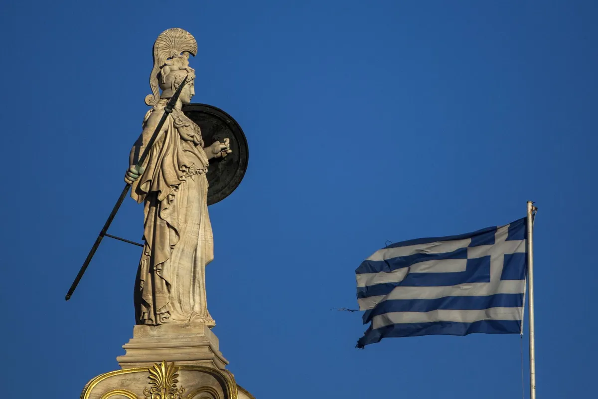 العَلم اليوناني يرفرف أمام تمثال أثينا (د.ب.أ)