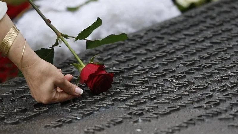 امرأة تلمس اسم أحد ضحايا تفجيرات لندن في 7 يوليو 2005 المنقوش على لوحة بالنصب التذكاري (متداولة)
