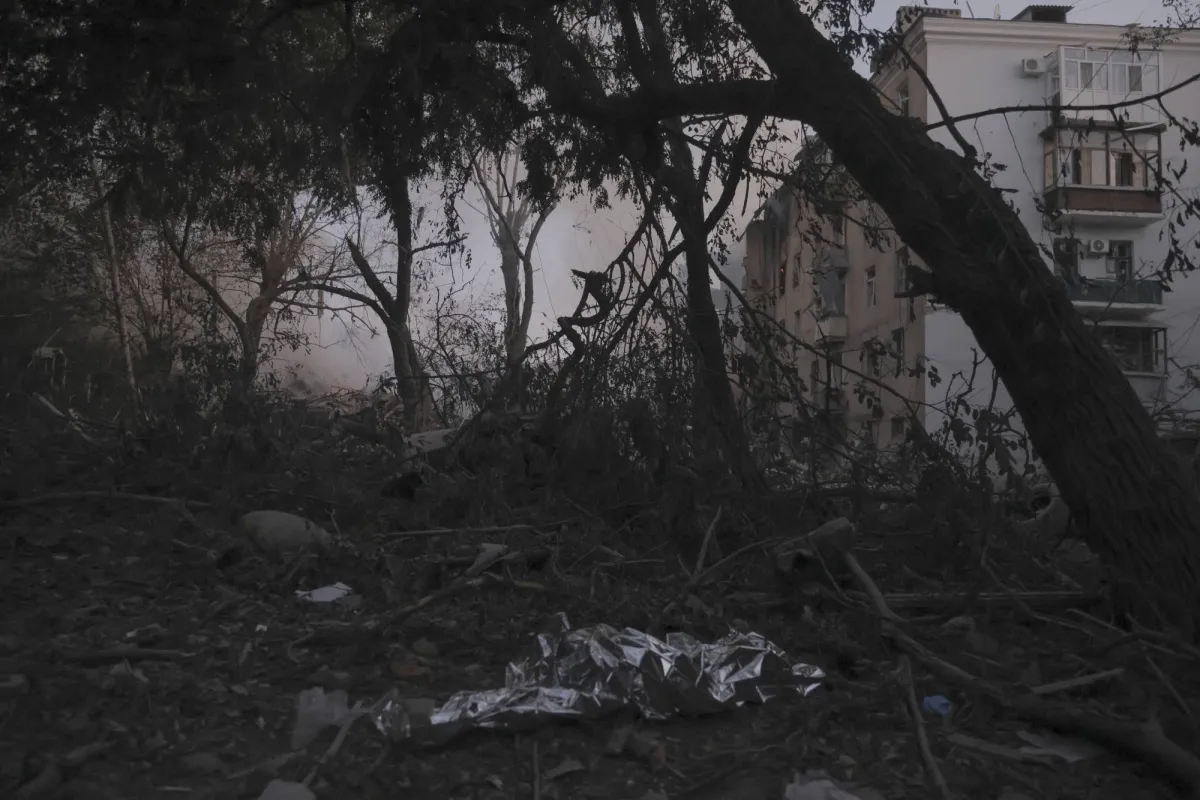 جثة مدني ملقاة على الأرض بعد غارة جوية روسية في كراماتورسك بأوكرانيا (أ.ب)