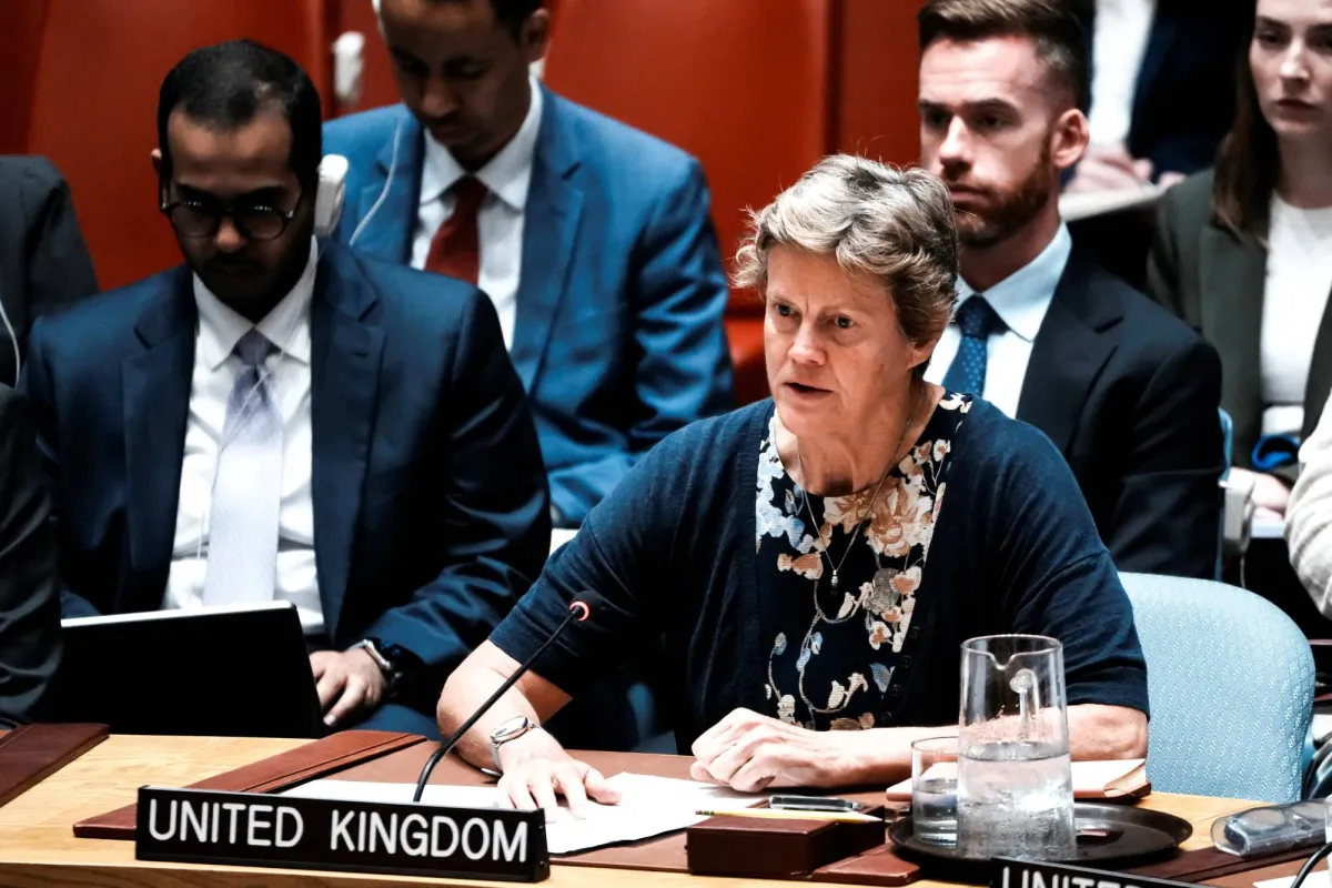 السفيرة البريطانية لدى الأمم المتحدة باربرا وودوارد تتحدث إلى المندوبين خلال اجتماع مجلس الأمن في مقر الأمم المتحدة في مدينة نيويورك، الولايات المتحدة 5 أغسطس 2025 (رويترز)