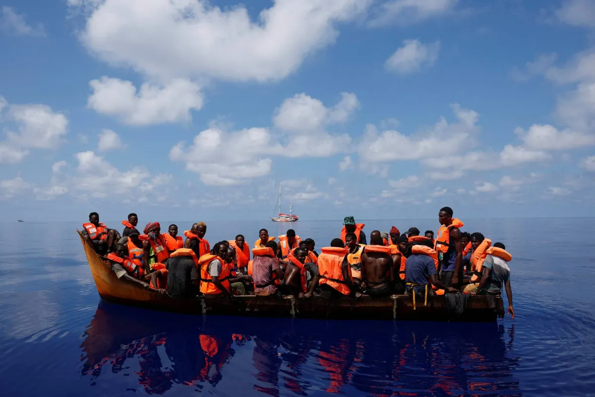 مهاجرون على متن قارب بالقرب من قارب إنقاذ في المياه الدولية جنوب لامبيدوزا في وسط البحر المتوسط... 11 أغسطس 2024 (رويترز)